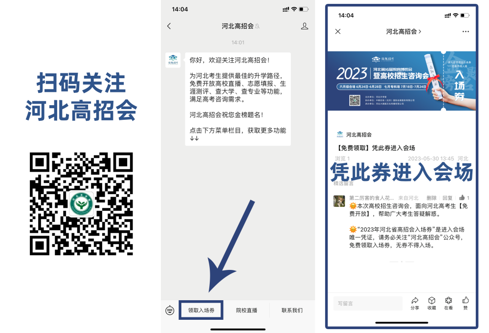 本次高校招生咨询会,面向河北高考生及家长免费开放,所有人员须关注“河北高招会”公众号,领取咨询会入场券,凭“入场券页面”进入咨询会现场。