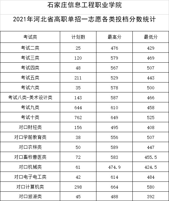 2021年石家庄信息工程职业学院高职单招一志愿投档分数线