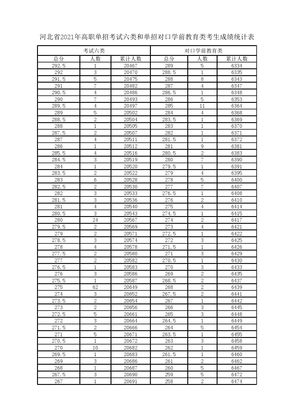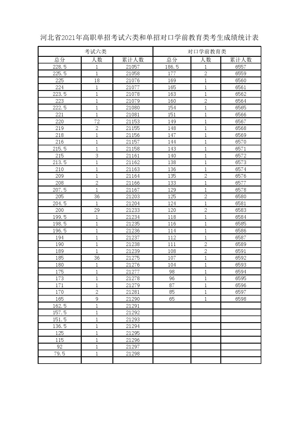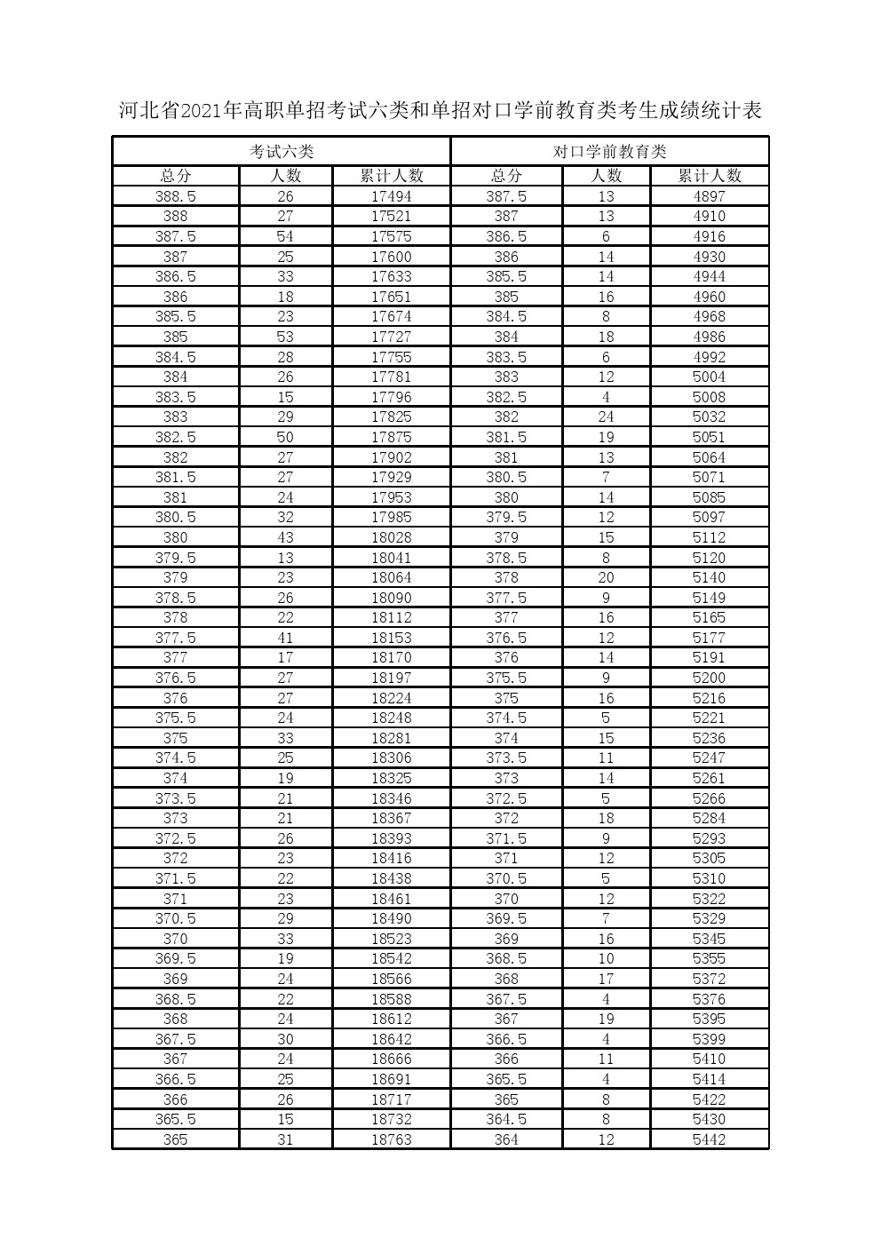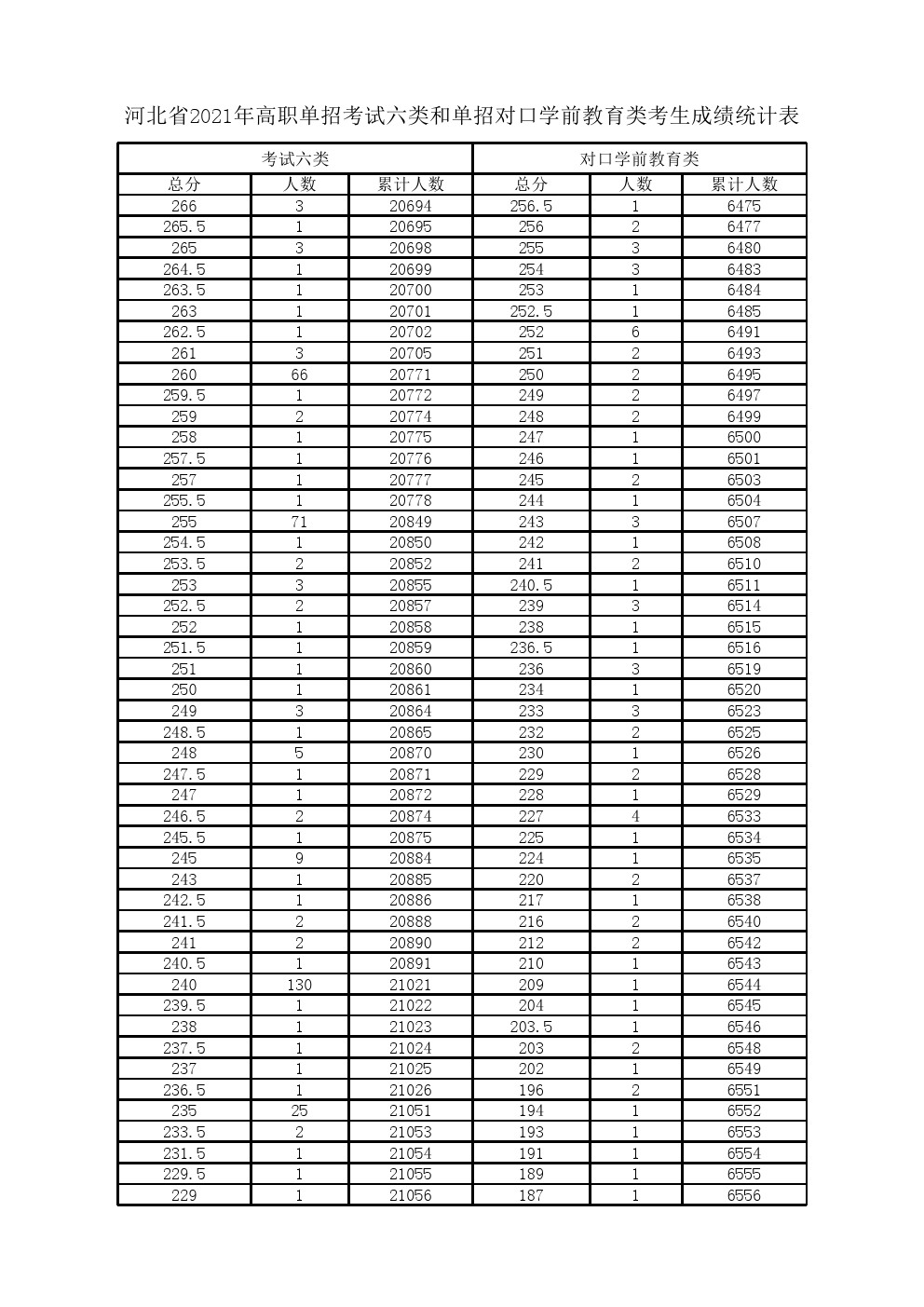2021年河北省单招考试六类、对口学前教育类一分一档表