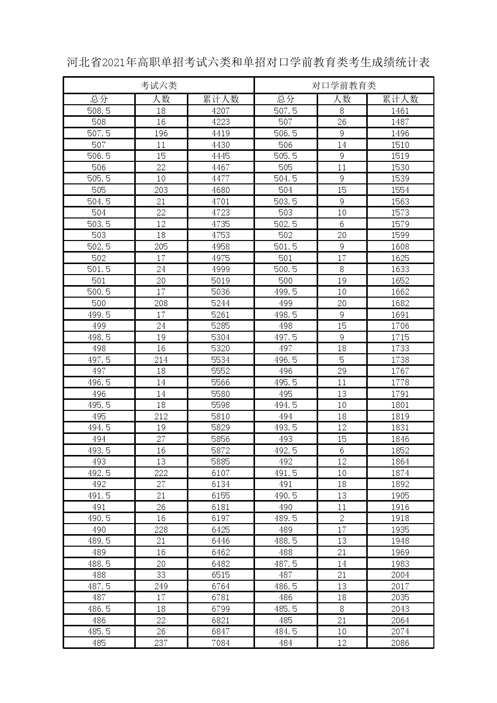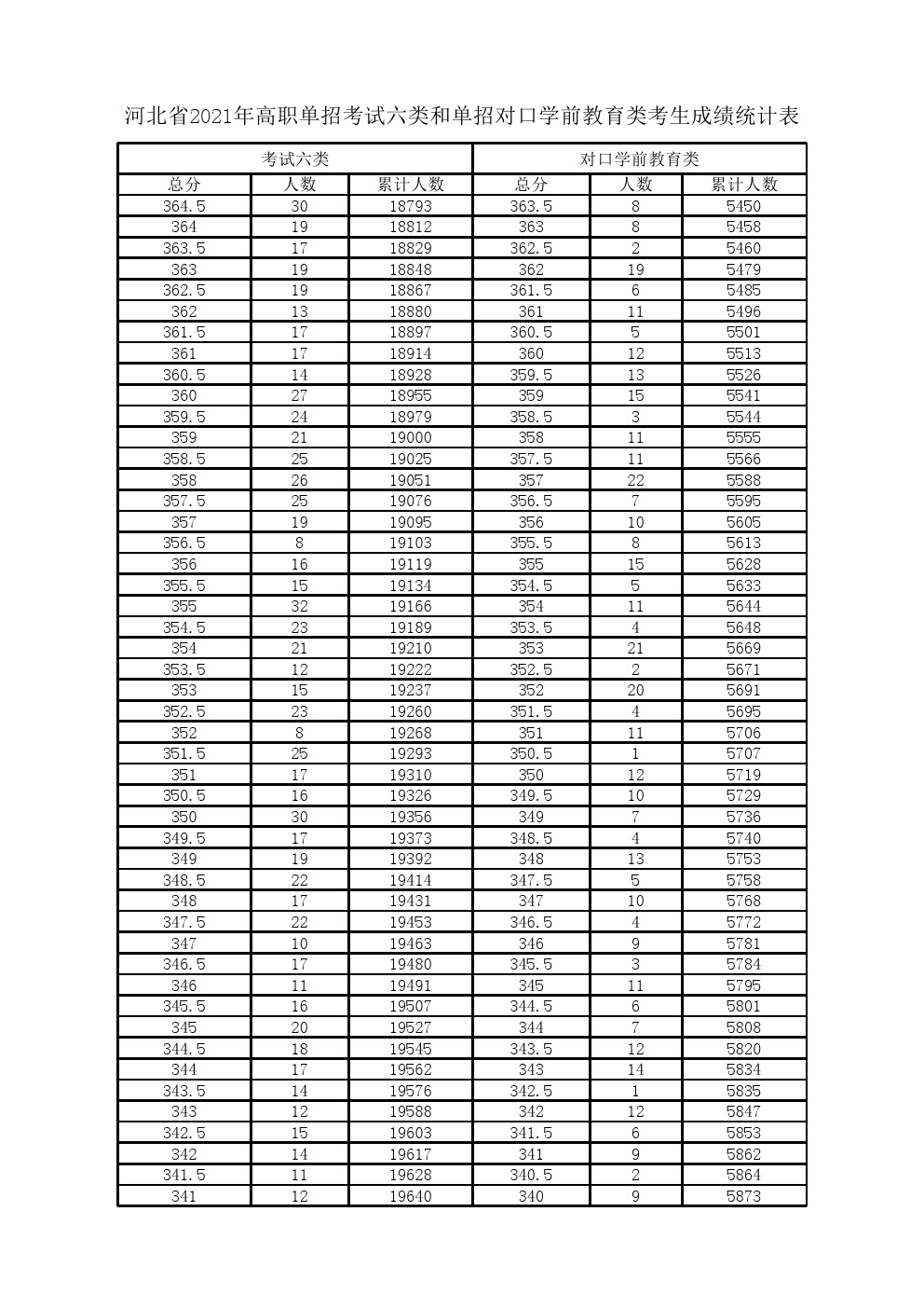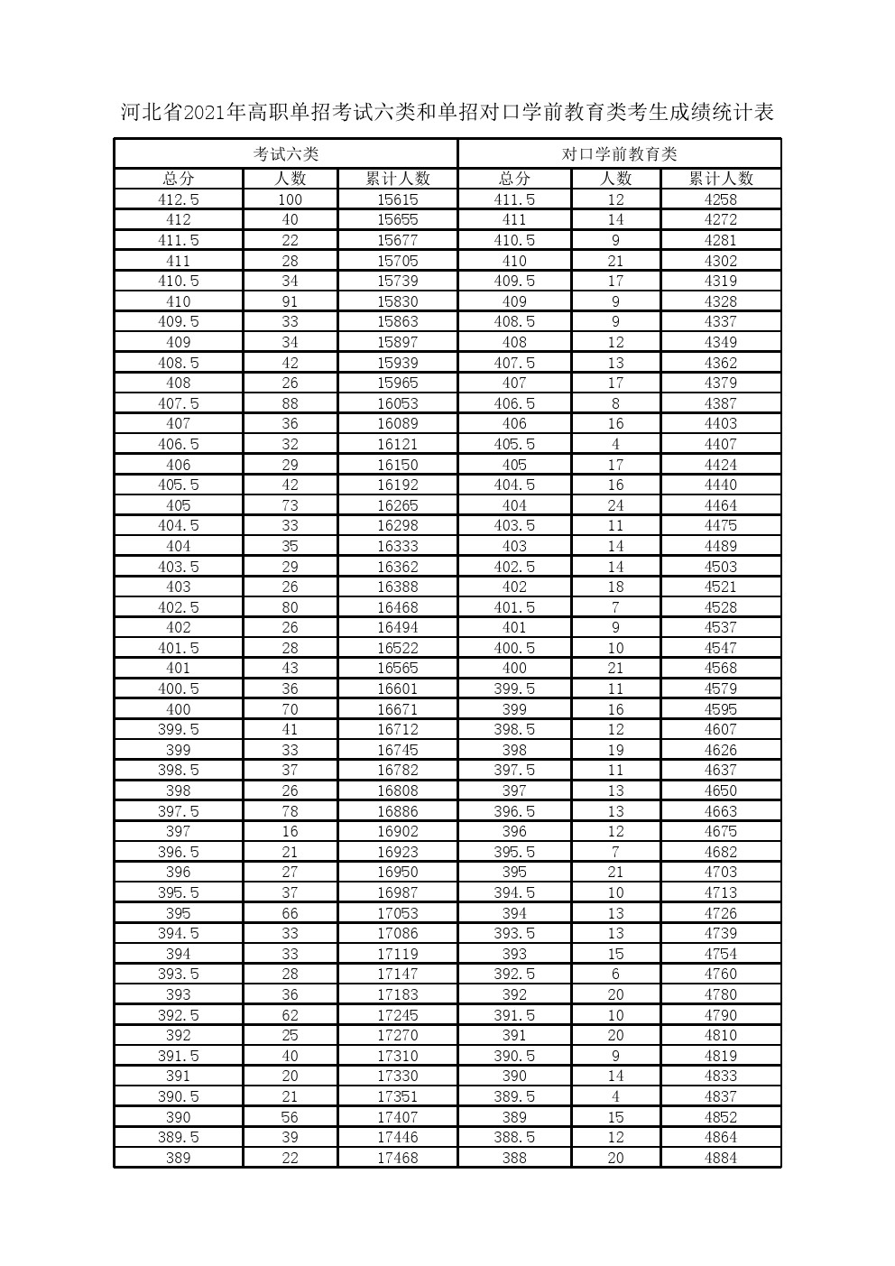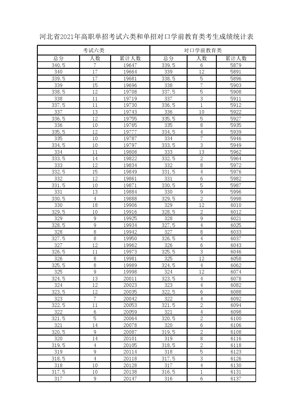 2021年河北省单招考试六类、对口学前教育类一分一档表