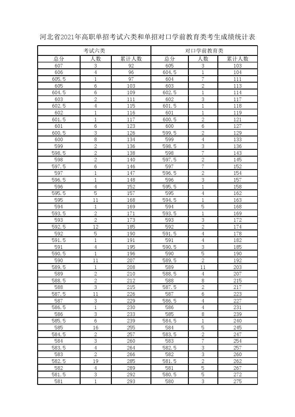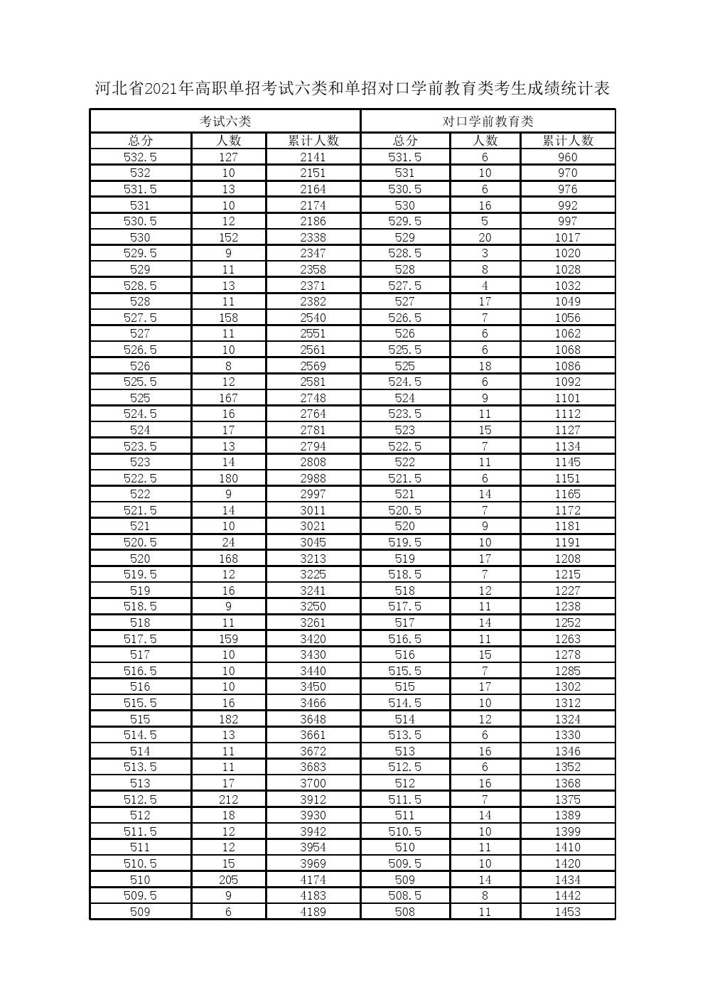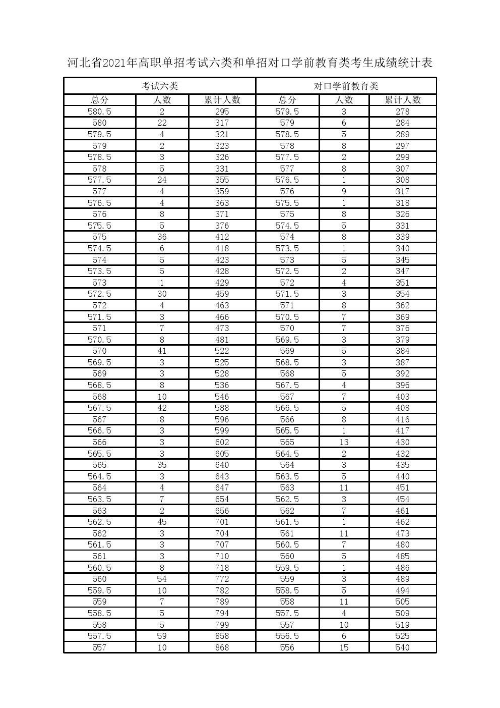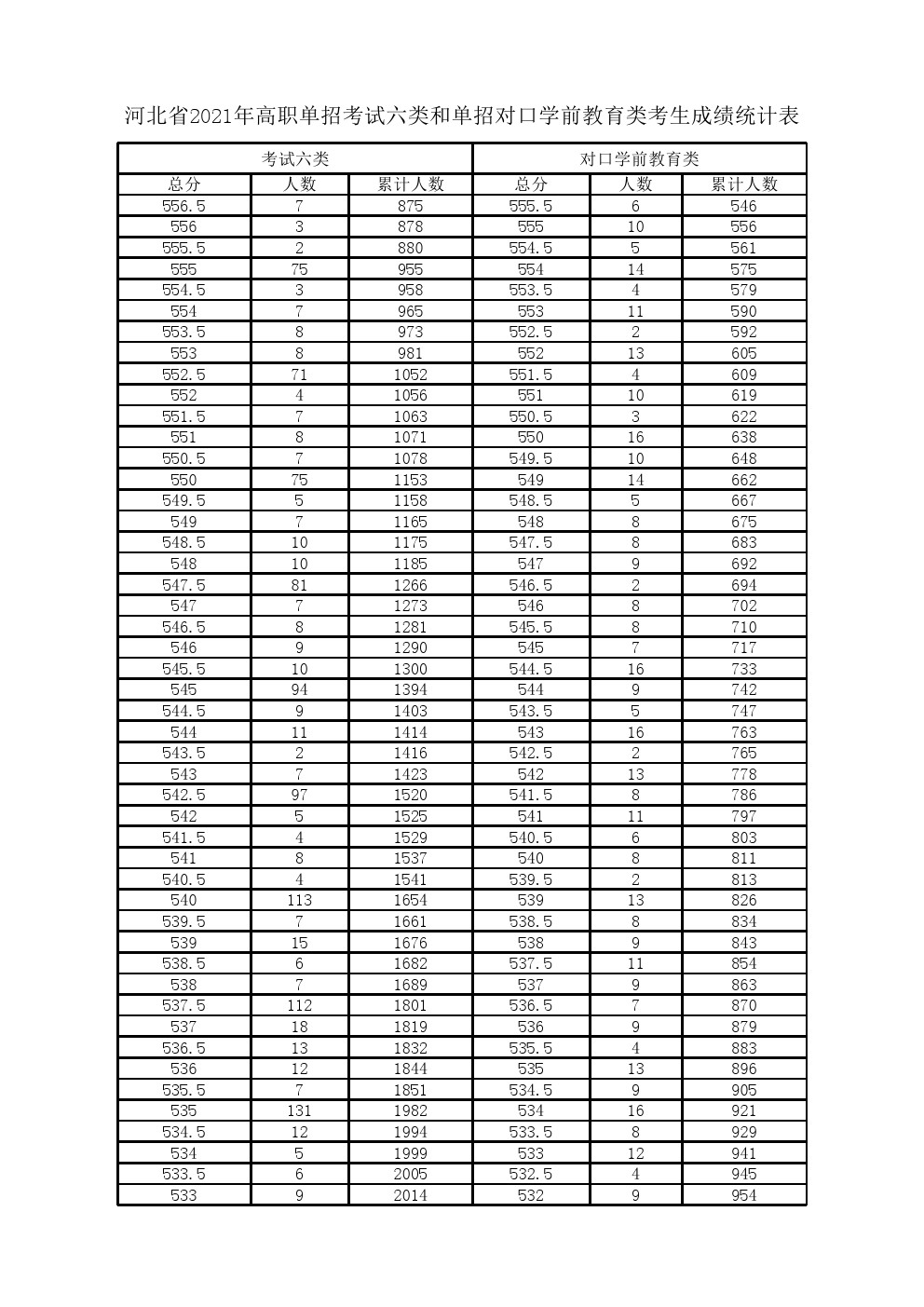 2021年河北省单招考试六类、对口学前教育类一分一档表