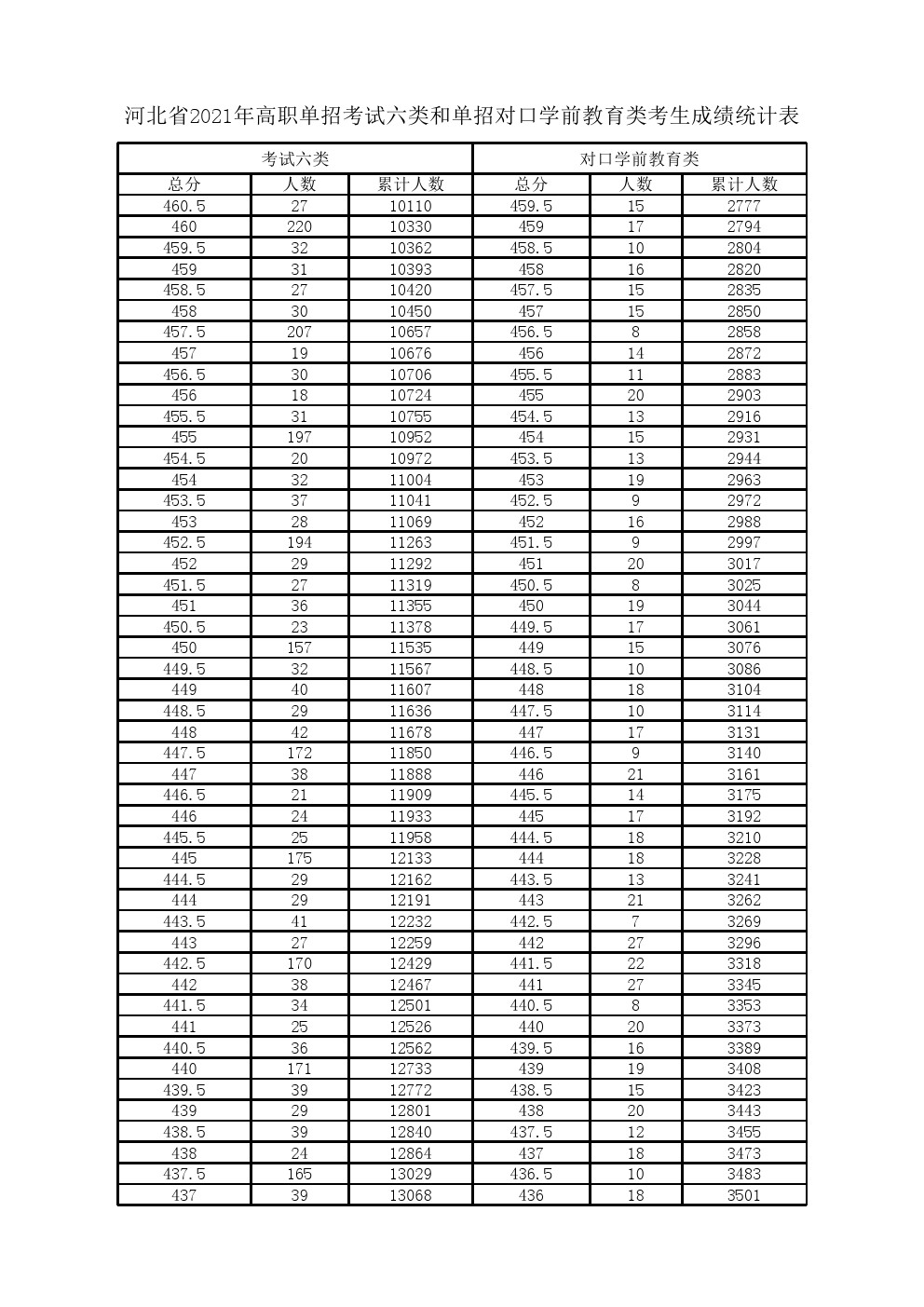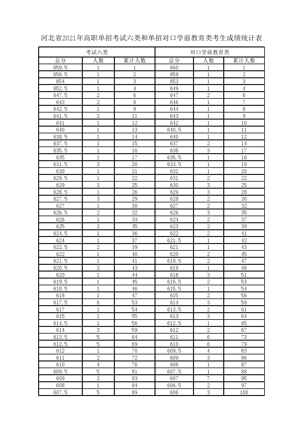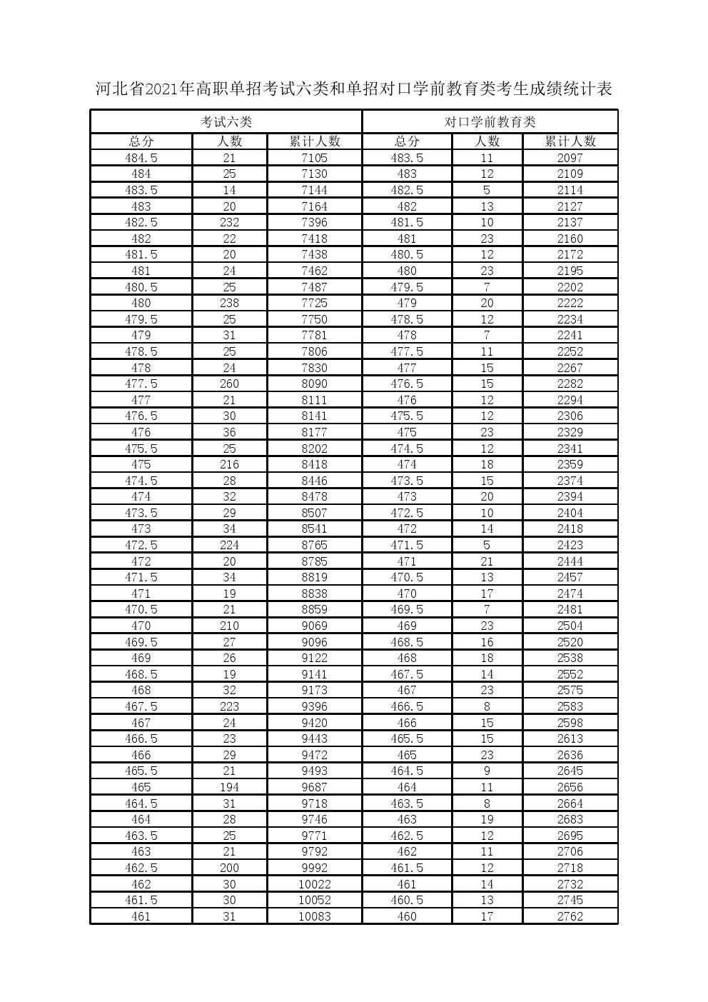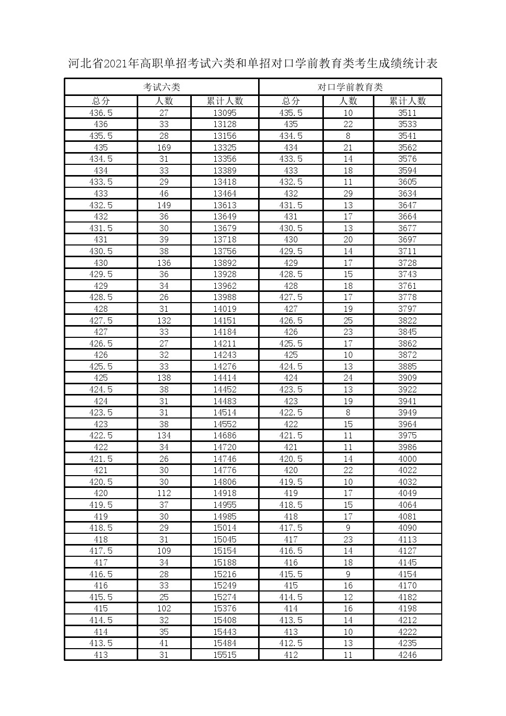 2021年河北省单招考试六类、对口学前教育类一分一档表