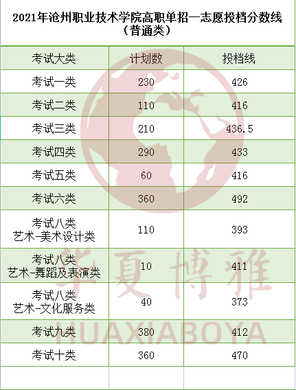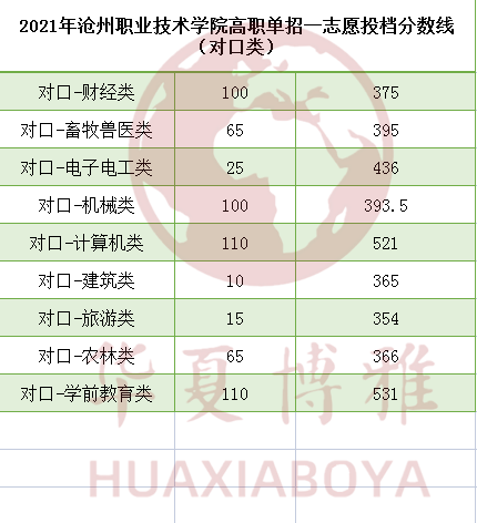 2021年沧州职业技术学院高职单招一志愿投档分数线